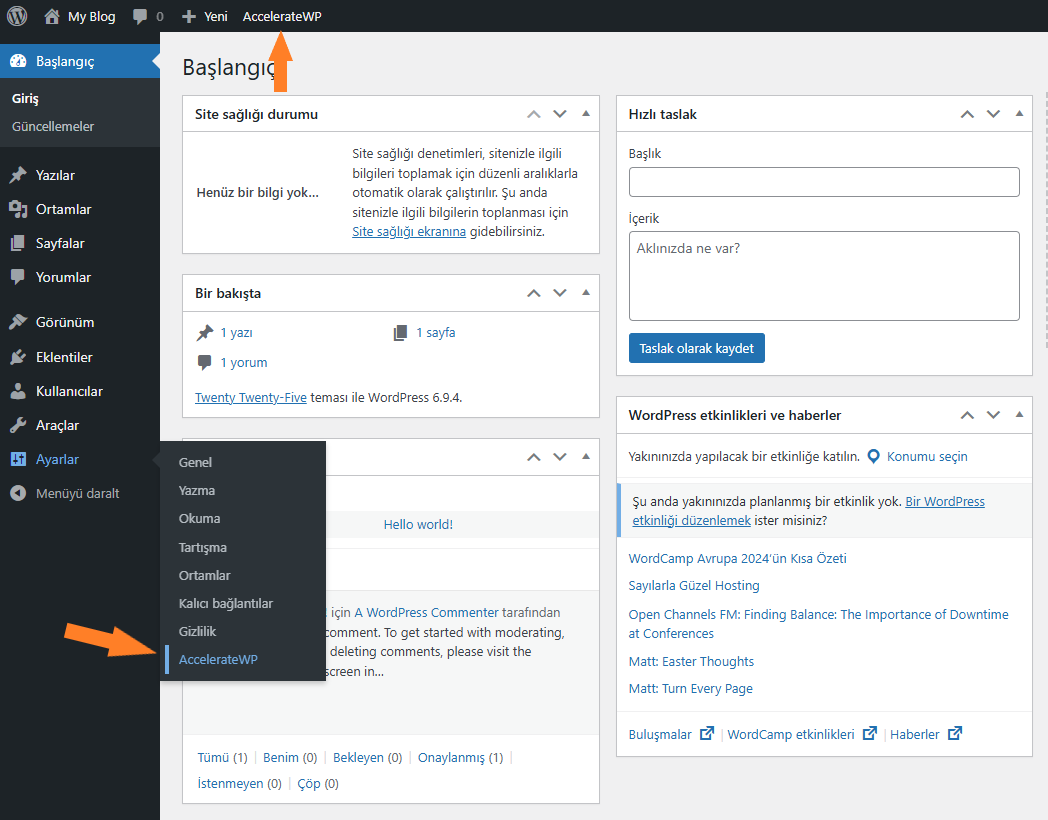 AccelerateWP aktif duruma geldikten sonra WordPress admin panelinize giriş yapın ardından Ayarlar > AccelerateWP seçeneğine tıklayıp panele giriş yapın.