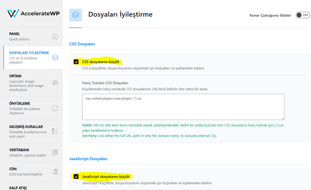 • Dosyaları İyileştirme (File Optimization): CSS ve JavaScript dosyalarını küçült seçeneklerini aktif ederek kod yükünü hafifletebilirsiniz.