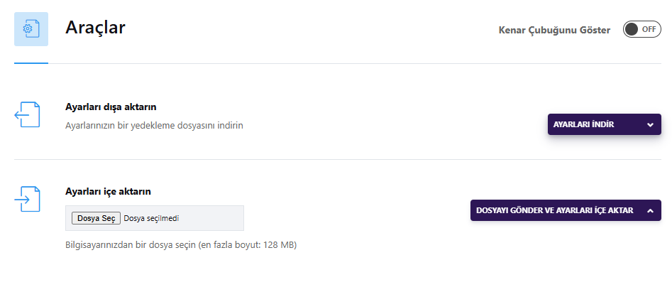 • Araçlar (Tools): Mevcut tüm optimizasyon ayarlarınızı kaydedebilir veya farklı sitelerinize aktarmak için içeri aktar seçeneğini kullanabilirsiniz.