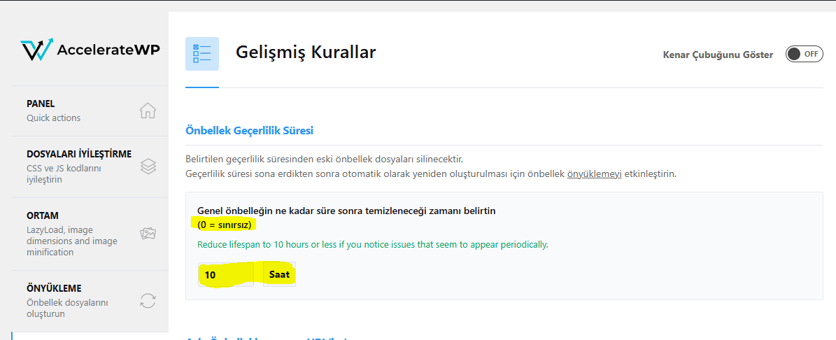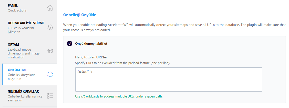 • Önyükleme (Preload): Ziyaretçi daha sayfaya girmeden içeriğin hazır edilmesini sağlayabilirsiniz. Önyüklemeyi aktif et dedikten sonra istisna istediğiniz URL’leri hemen altındaki kutucuğa ekleyebilirsiniz.