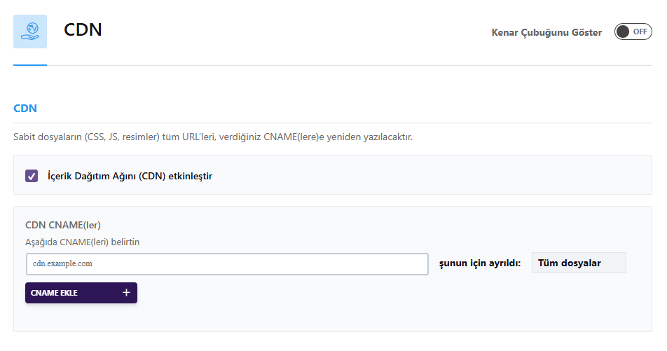 • CDN: Kendi CNAME yapınızı ekleyerek içerik dağıtım ağı entegrasyonu sağlayabilirsiniz.
