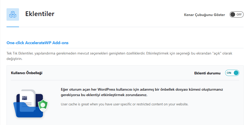 • Eklentiler (Add-Ons): Her kullanıcıya özel (oturum açmış kullanıcılar dahil) önbellek dosyası oluşturmak istiyorsanız bu özelliği aktif edin.
