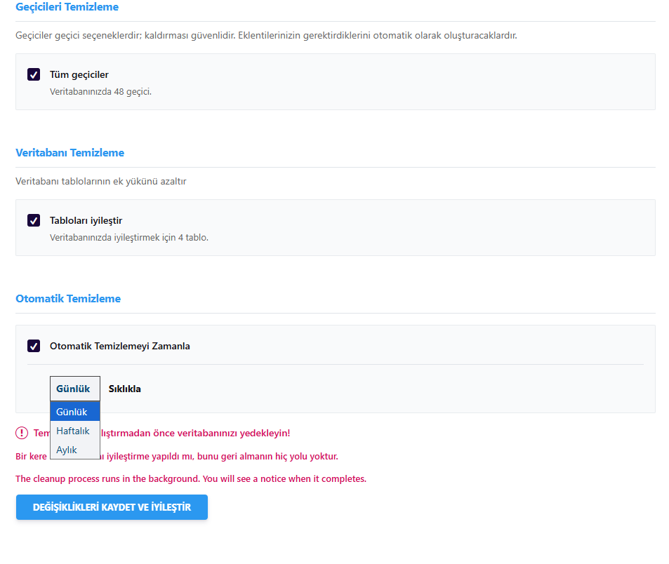 • Veritabanı (Database): Gönderiler, yazılar ve yorum veritabanı önbelleğini temizleyerek veritabanı performansını optimize edebilirsiniz. Ayrıca Otomatik Temizleme özelliğini aktif ederek Günlük/Haftalık/Aylık olarak otomatik temizliği aktif edebilirsiniz.