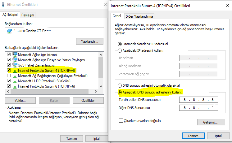 - Google (8.8.8.8) çıktı ise: Üst: 8.8.8.8 | Alt: 8.8.4.4