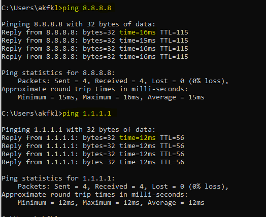 ping 1.1.1.1(Cloudflare DNS testi)ping 8.8.8.8(Google DNS testi)